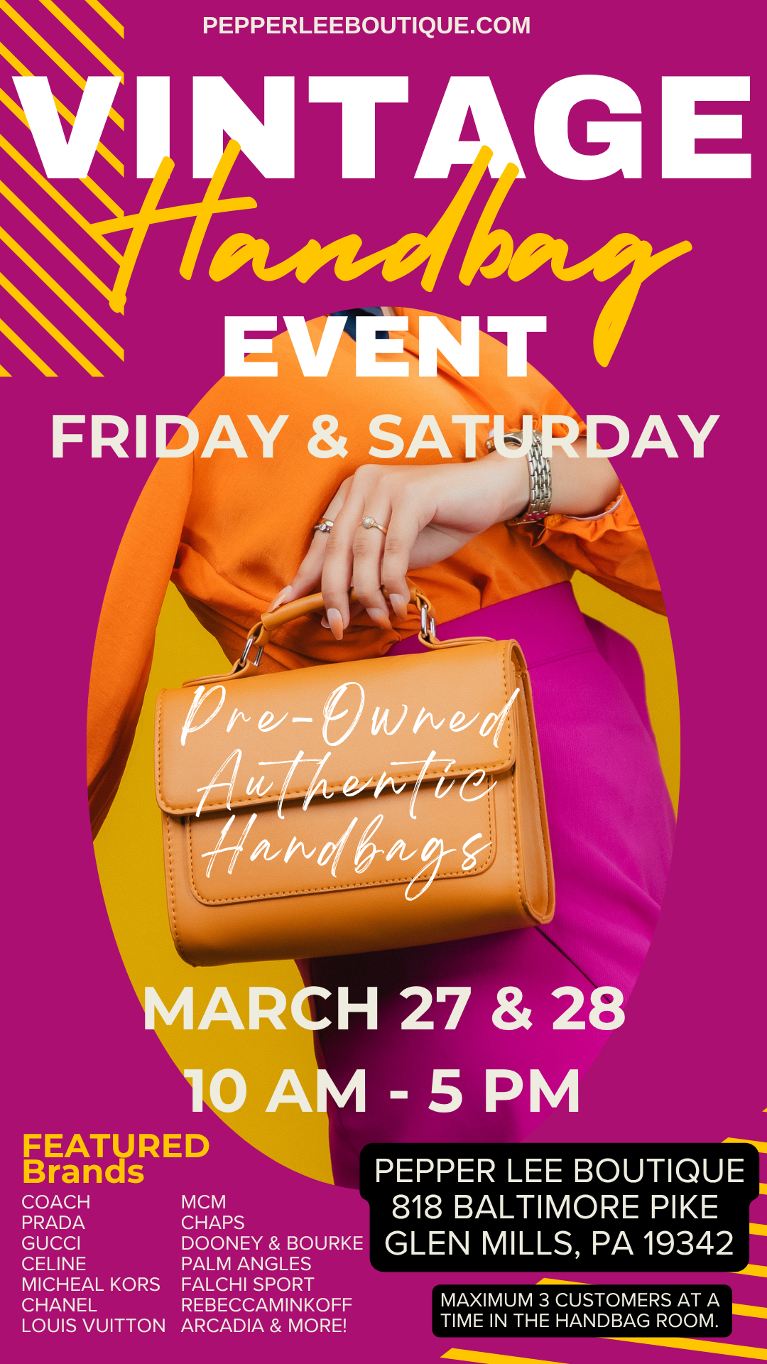 Preowned luxury bags from our amazing consigners are launching this weekend! Featuring vintage brands like Coach, Prada, Gucci, Louis Vuitton, MCM, Chaps, and Dooney & Bourke. This Friday & Saturday, March 27 & 2810 AM – 5 PM. Maximum of 3 customers at a time in the handbag room—shop early and don’t miss out!